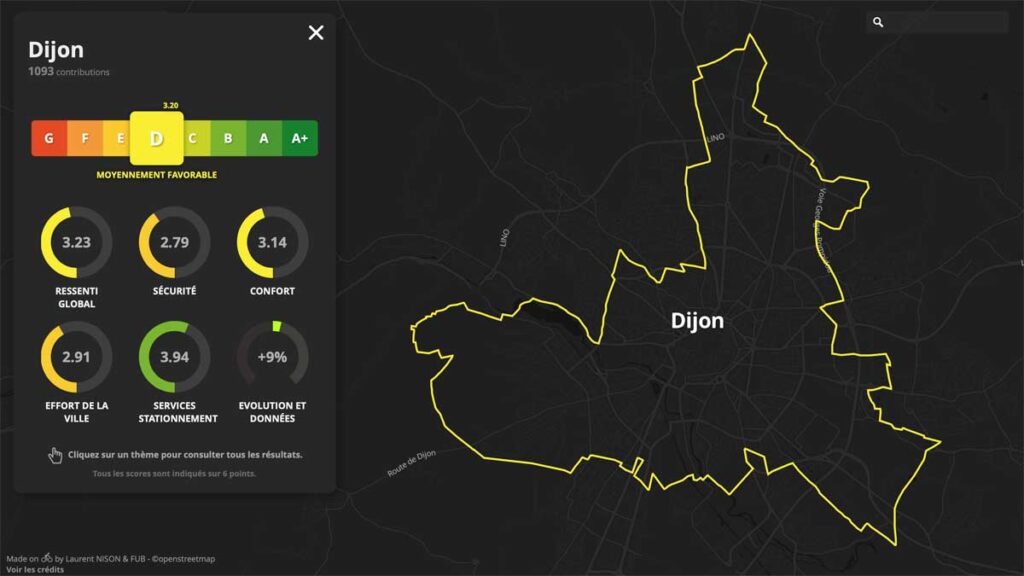 En 2017, la ville de Dijon avait été classée 2è de sa catégorie (villes entre 100 000 et 200 000 hab.) derrière Grenoble et devant Angers. La Métropole dijonnaise s’était largement félicitée de ce « succès » mais sans prêter beaucoup d’attention ni à la note obtenue, « D » c’est dire seulement « moyennement favorable », loin derrière celle de la ville de Grenoble, ni aux attentes que les usagers cyclistes avaient clairement et fortement exprimées à cette occasion (citons par exemple, la demande d’un vrai réseau cyclable, sécurisé et continu).