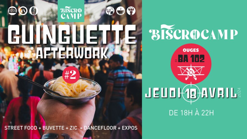 Encore une fois, le Biscrocamp réunira familles, amis et collègues de travail à l’ex BA 102 pour une soirée printanière, conviviale et festive, autour de la bonne chaire. Brasero, barbecue japonais, brochettes thaï et orientales, œufs Bénédicte, salades variées, pâtes dans la meule de parmesan, pâtisseries… La deuxième Guinguette Afterwork profite des rayons de soleil pour se mettre à l’heure d’été ! Et pour accompagner ces délices, rien de mieux qu’une buvette à l’ancienne ! Comme pour la première édition, la culture et le divertissement prendront une part importante : la soirée sera animée par un zic dancefloor, et intégrera une exposition.