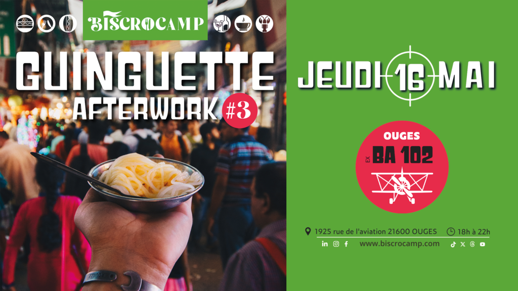 Le troisième rendez-vous de la Guinguette Afterwork du Biscrocamp aura lieu ce jeudi, entre 18 h et 22 h, à l’ex BA 102 (1925, rue de l’aviation, 21600 Ouges). L’entrée se fait sans réservation !