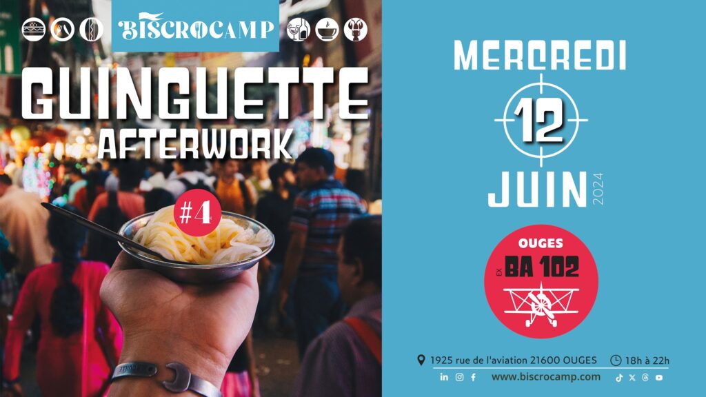 Le quatrième rendez-vous de la Guinguette Afterwork du Biscrocamp aura lieu ce mercredi 12 juin, entre 18 h et 22 h, à l’ex BA 102 (1925, rue de l’aviation, 21600 Ouges). L’entrée se fait sans réservation !