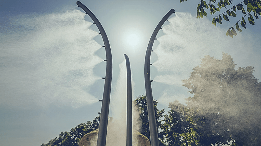 Chaque brumisateur sera relié au réseau d’eau potable. Cependant, la consommation sera de seulement quelques litres d’eau par heure. Ils seront actifs de 10 heures à 20 heures, à la demande avec un bouton-poussoir. Notez : il y aura différents types de brumisateurs : sur mât, sur palmiers ou avec des fils tendus entre les arbres.