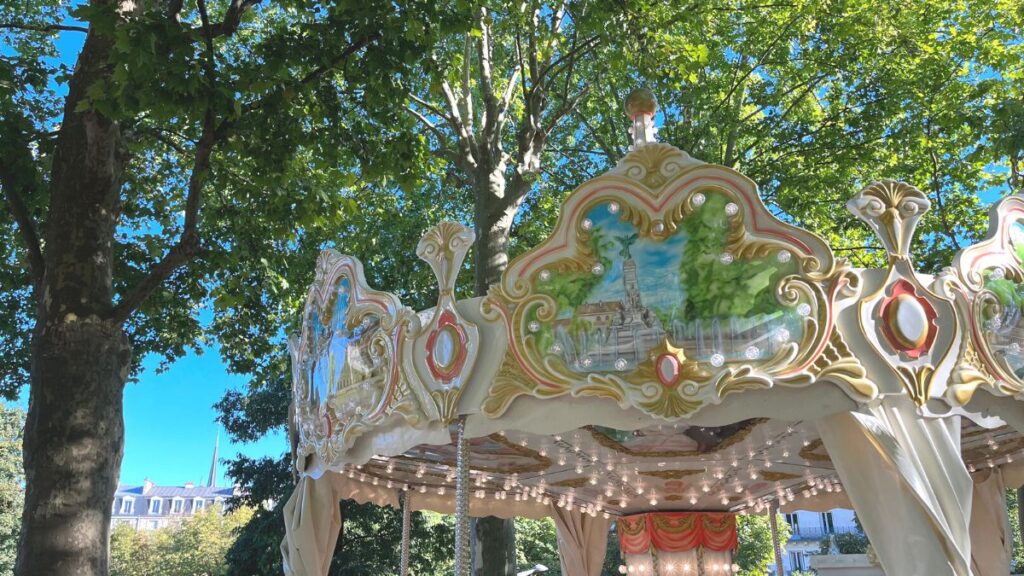 Depuis quelques jours maintenant, un carrousel est installé tout en haut des escaliers du jardin Darcy, juste à côté du kiosque. Un soin tout particulier a été apporté à la décoration. En effet, on peut y voir des illustrations « à l’ancienne », représentants ainsi la place de la République, la Porte Guillaume ou encore le voisin : l’Ours Pompon.