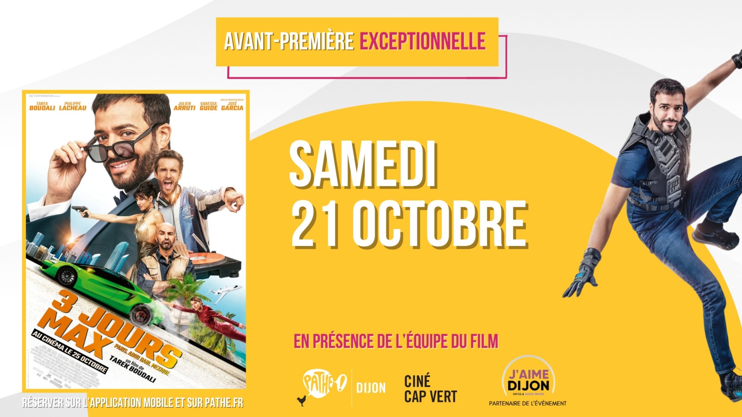 Participez à notre jeu concours en partenariat avec le cinéma Pathé Dijon et remportez vos invitations pour 2 personnes pour assister à l’avant-première du film « 3 jours max », en présence de l’équipe du film !