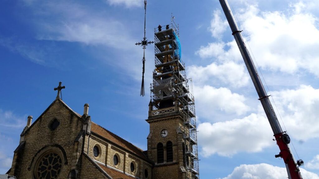 Ces deux éléments caractéristiques de l’église n’étaient plus à leur place depuis 2018. En effet, lors d’un changement de paratonnerre en 2017, les ouvriers avaient remarqué des infiltrations sur la flèche en bois, au sommet de la croix.