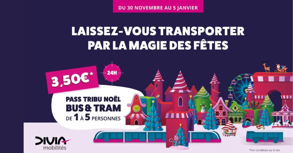 À l’occasion des fêtes de fin d’année, DiviaMobilités propose le PASS 24H Tribu Noël à 3,50€. Ce titre exceptionnel permet de voyager de 1 à 5 personnes toute la journée à volonté à prix malin sur l’ensemble du réseau bus et tram !