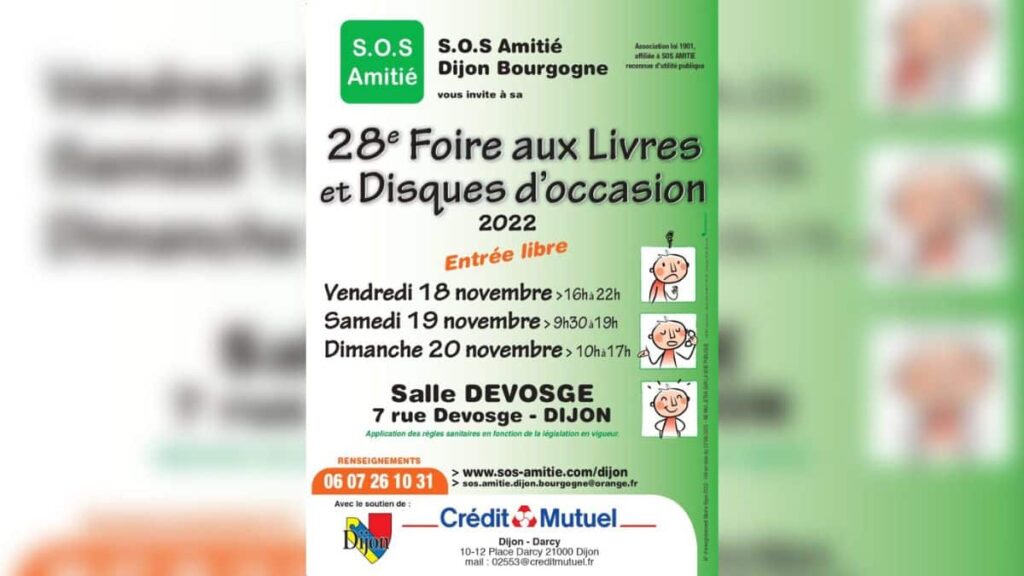 Pour les amoureux de lecture et de musique, la foire aux livres et aux disques de l’association SOS Amitié aura lieu du 18 au 20 novembre à la salle Devosge.