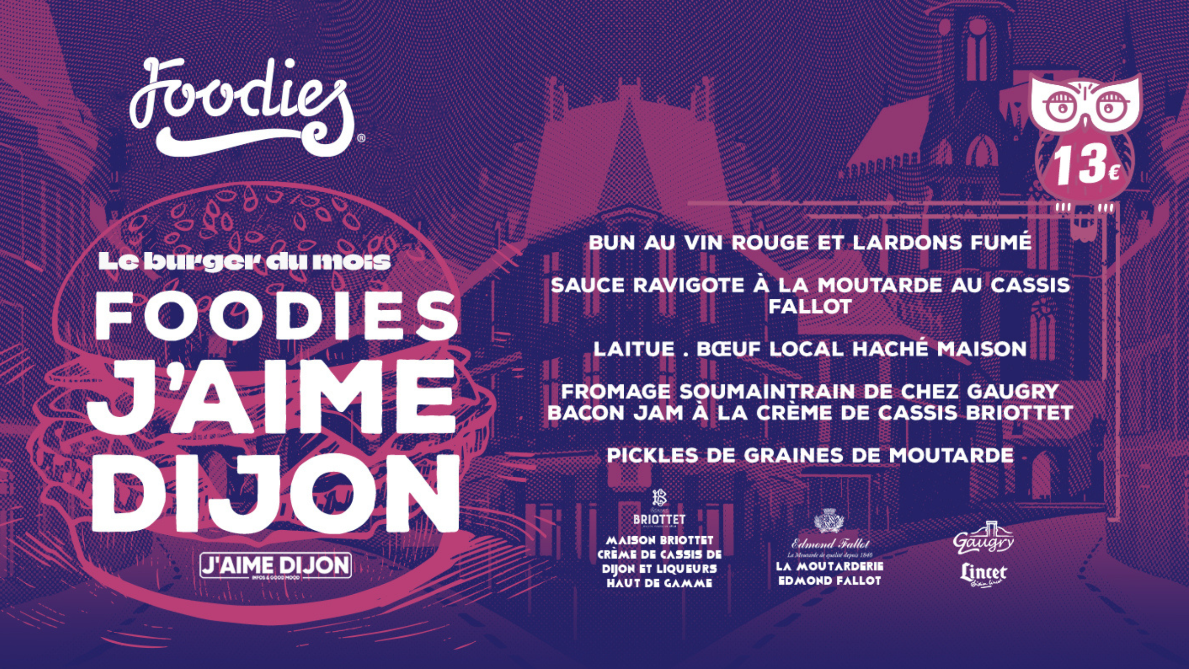 Moutarde, Cassis, Soumaintrain… Local et délicieux, le burger J’aime Dijon concocté par Foodies réunit les gourmandises et douceurs de la capitale ducale et de sa région. Il est dispo à la carte en food truck...