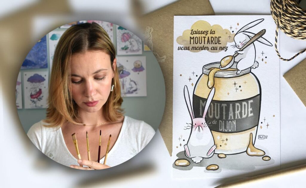Amoureuse de la région et de la nature, elle travaille sur une collection de carte postales et d’affiches humoristiques sur la région et ses spécialités. C’est une première collection de 6 à 7 cartes postales lapins différentes, associées à celles des villes célèbres de Bourgogne, typographiées à la main, dans les mêmes coloris (soit environ 20 modèles de cartes différents)