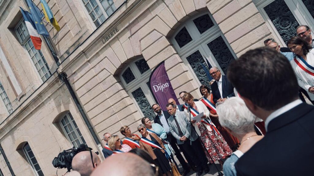 🇫🇷🙏 350 personnes étaient rassemblées ce midi dans la cour d’honneur du Palais des Ducs à l’initiative de l’Association des Maires France. Nathalie Koenders, première adjointe au maire de Dijon y a donné lecture de « l’appel des maires de France » en soutien aux élus agressés pendant les émeutes. + d’infos dans notre article (suivre notre lien) 🙏 Plus de 150 personnes se sont réunies à Chenôve, environ 100 personnes devant la mairie de Longvic, de Saint Apollinaire, deFontaine-les-Dijon et de Chevigny-Saint-Sauveur. ; 80 personnes à Talant