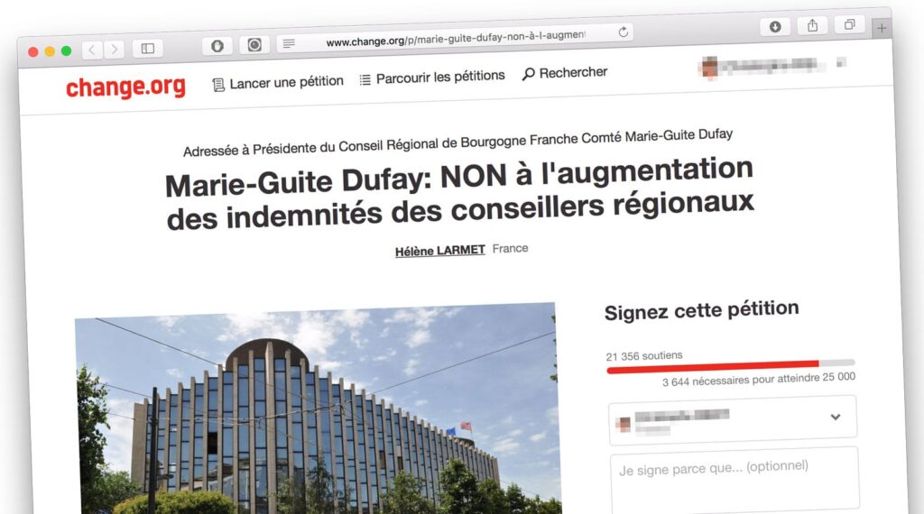 Au lendemain du vote à l’assemblée plénière du jeudi 21 janvier, où les conseillers régionaux de Bourgogne-Franche-Comté nouvellement élus ont voté une augmentation de 20% du régime indemnitaire des « élus de base » et suite aux nombreuses réactions sur internet, en particulier dans les commentaires des articles de presse relatant cette augmentation, que Hélène Larmet décide de mettre en ligne la pétition adressée à Présidente du Conseil Régional de Bourgogne Franche Comté Marie-Guite Dufay « Marie-Guite Dufay: NON à l’augmentation des indemnités des conseillers régionaux ».