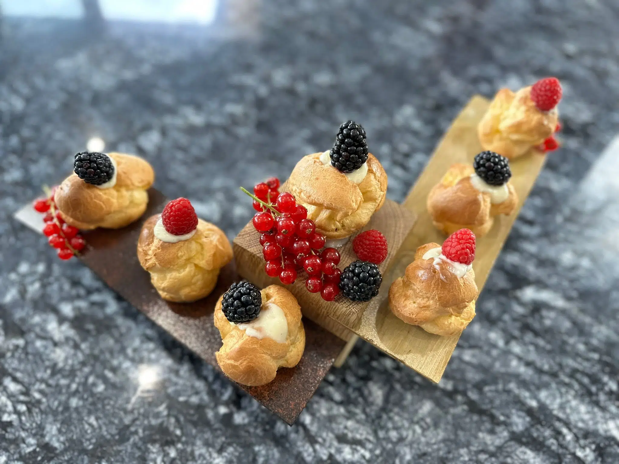 - Versez la crème dans une poche à douille et, à l’aide d’une douille de pâtisserie ou de la pointe d’un couteau, percez un trou à la base de nos choux. Garnissez-les généreusement, puis décorez-les avec quelques touches de crème et des fruits frais ou confits selon vos goûts.