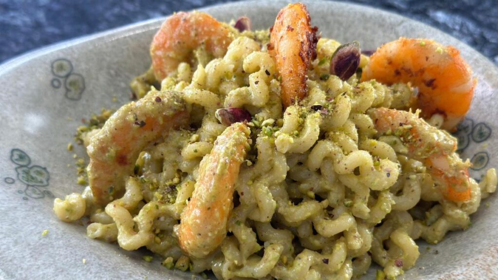 - Dresser votre assiette et nos pâtes au pesto de pistaches et crevettes sont prêtes, crémeuses et parfumées. Buon Appetito !