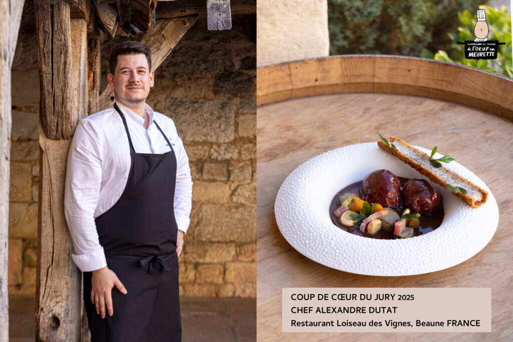 Le Prix Coup de Cœur 2025 a quant à lui été attribué à Alexandre Dutat, chef du restaurant Loiseau des Vignes à Beaune. Sa version de l’œuf en meurette a séduit le jury par son équilibre et sa finesse, rendant un bel hommage à la tradition locale.