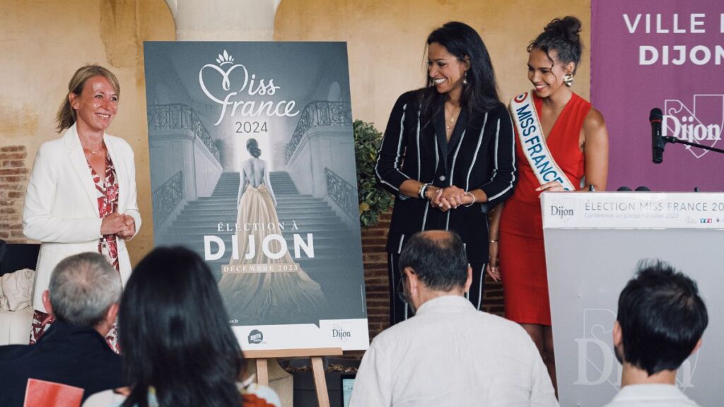 « En tant que directrice du concours Miss France et Bourguignonne, c’est avec une immense joie et une fierté particulière que j’ai l’honneur d’annoncer que Dijon sera la ville qui accueillera cette édition de Miss France 2024″, annonce fièrement Cindy Fabre, elle-même Dijonnaise. C’est avec beaucoup d’enthousiasme que la nouvelle directrice du concours se prépare à accueillir cette cérémonie « à la maison ». À ses côtés ce matin-là, Indira Ampiot, Miss France 2023 dit aussi être « tombée amoureuse de ce patrimoine et de cette ville ».