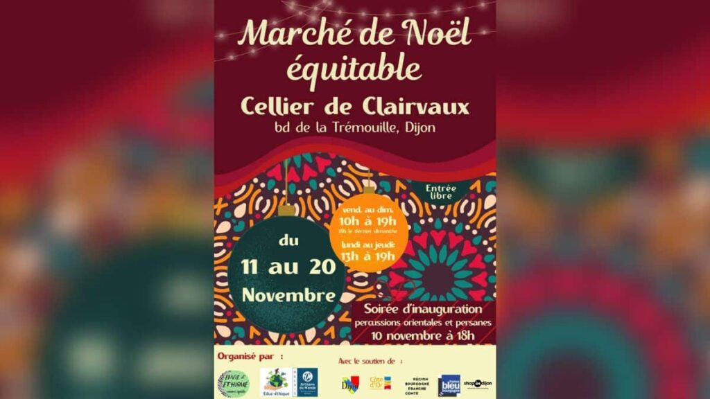 Le Marché de Noël Équitable est organisé par la boutique Envie d’Ethique et l’association Artisans du Monde. Il aura lieu au Cellier de Clairvaux, 27 boulevard de la Trémouille à Dijon du 11 au 20 novembre 2022.