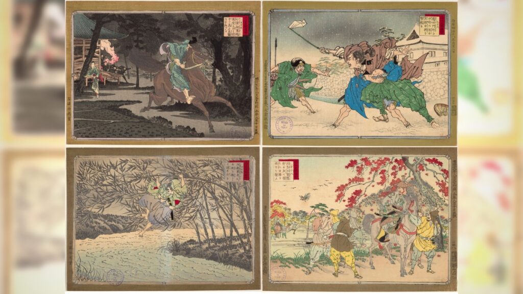 Réalisées par Adachi Ginkô entre 1885 et 1888, les estampes racontent l’histoire du Japon où l’on retrouve des scènes de samouraïs ainsi que des maîtres de thés et des grands intellectuels de leur ère.