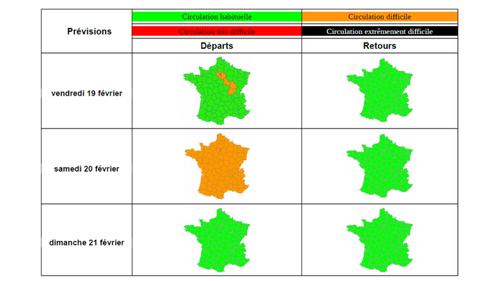 Un coup d’œil sur vos conditions de circulation prévues par Bison Futé pour ce week-end, où des difficultés de circulation sont attendues. En effet, les vacances débuteront pour les écoliers de la zone B, alors qu’elles s’achèveront pour ceux de la zone A. La zone C entame quant à elle sa seconde semaine de congés.