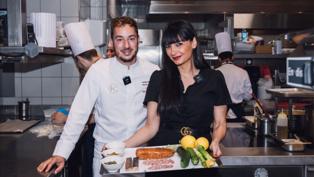 Truite Bio Ikejime, Saucisse de Morteau, Petits Pois et Croustillant Farce Fine aux Œufs de Truite, Sauce Miso et Saké de Bourgogne : ce plat marie des ingrédients locaux avec des saveurs orientales, créant une véritable alchimie gustative.