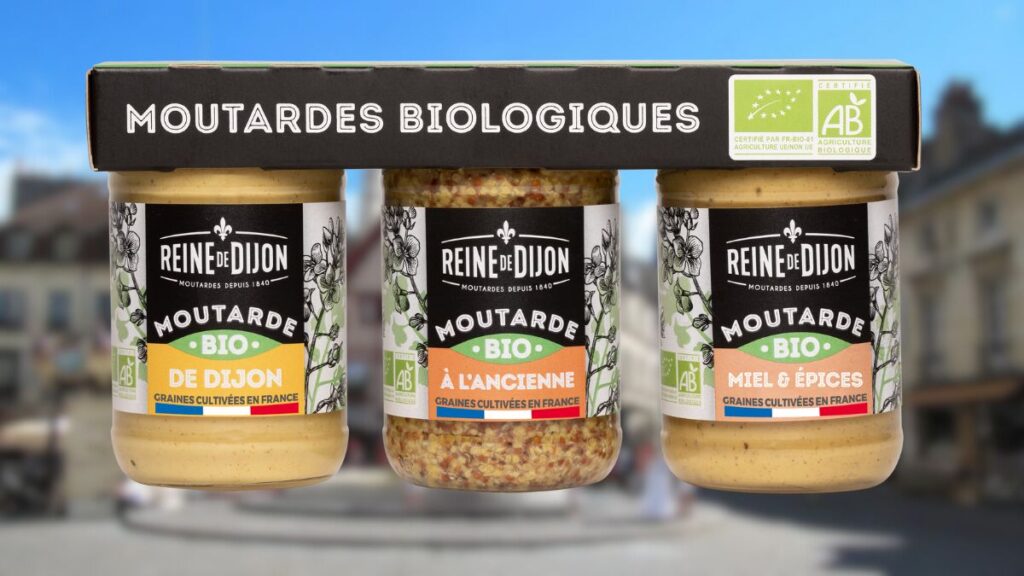 Cette belle alliance permet aujourd’hui aux moutardiers de proposer des moutardes locales et récoltées en bio dans le respect de l’environnement. Reine de Dijon est fière de pouvoir proposer une nouvelle gamme bio et locale, qui vient s’ajouter à l’ensemble de sa gamme conventionnelle. 3 nouvelles recettes sont à découvrir : La moutarde bio de Dijon, la moutarde bio à l’ancienne et la moutarde bio Miel & Épices. Une gamme née pour répondre aux attentes des consommateurs soucieux de leur santé et de l’environnement.