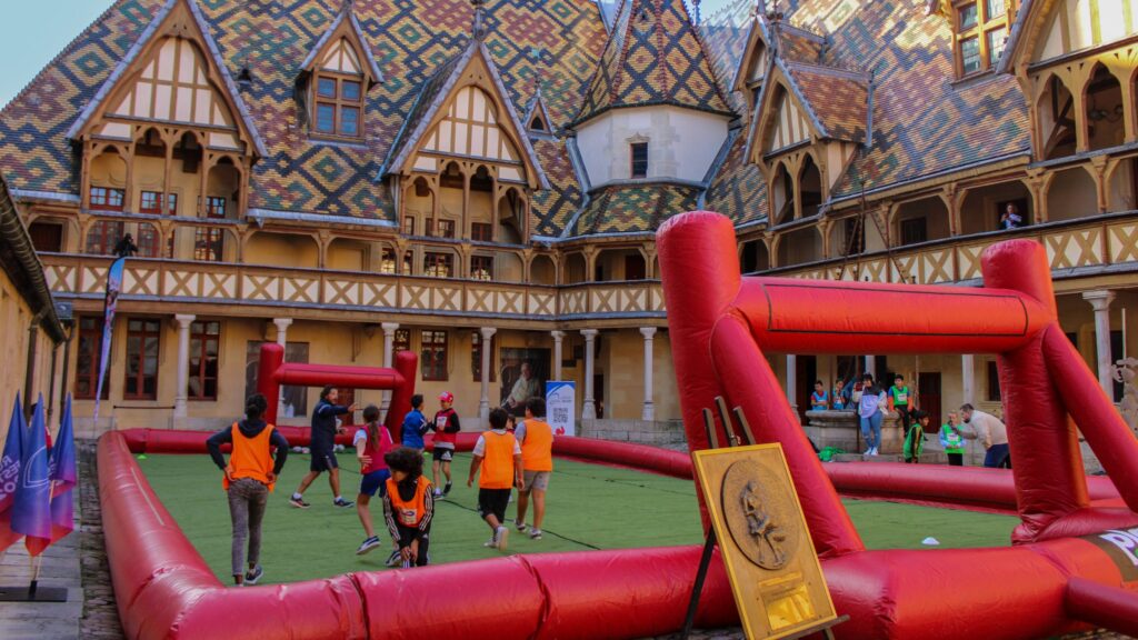 Quand la cour de l’Hôtel-Dieu des Hospices de Beaune se transforme en terrain de rugby pour une journée inoubliable, sous les yeux du président de la Fédération française de rugby.