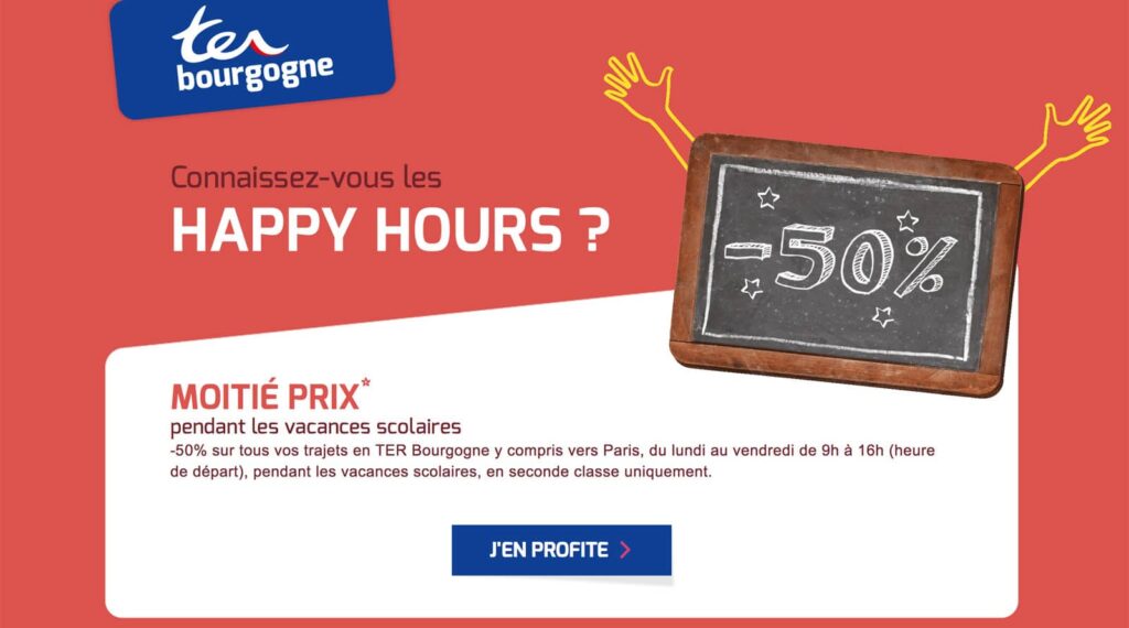 Pendant les vacances scolaires, du 15 au 26 février 2016, ce sont les Happy Hours du TER Bourgogne. Voyagez à moitié prix et sur toutes destinations en TER Bourgogne y compris vers Paris via Laroche et Sens du lundi au vendredi de 9h à 16h en seconde classe.