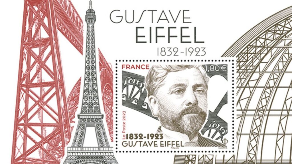 Sur le timbre, on y découvre le visage de l’ingénieur. Son œuvre la plus connue de toute, la Tour Eiffel, trône en arrière plan.